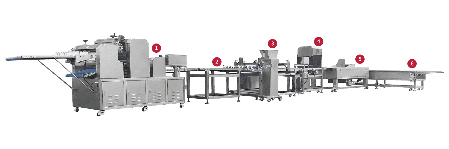 Produkční linka se skládá z stroje na výrobu chleba s pečivem ST-868-600, čtyřkanálového posunu, čtyřkanálového stroje na mouku, čtyřkanálového koncentrovaného stroje, CT-QT450 Dvojitý servo spalený střih chleba a CT-WP500 pro uspořádání desky (model 500). .